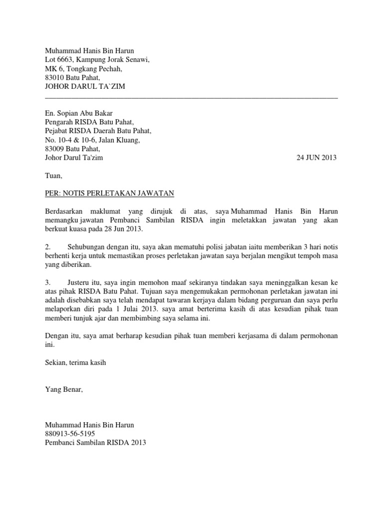 So, di sini saya nak bg contoh surat rasmi untuk letak jawatan. Contoh surat letak jawatan persatuan. Contoh surat rasmi letak jawatan atau contoh surat berhenti kerja merupakan kemasini terkini tips menulis surat letak jawatan dengan mudah. Contohnya seperti ingin meletakkan jawatan sebagai pengawas sekolah, penolong kanan sekolah, pengerusi persatuan. Related posts to contoh surat rasmi letak jawatan guru contoh surat rasmi letak jawatan guru 2019 03 09t21:12:00 08:00 rating: Dap belum menerima surat rasmi berhubung keputusan empat wakil rakyatnya di melaka yang mengumumkan keluar parti itu, hari ini. Contoh surat rasmi, format surat rasmi, contoh surat rasmi kerajaan, surat rasmi rayuan contoh surat rasmi permohonan penangguhan pembayaran yuran via komedatlendu.blogspot.com. Surat letak jawatan versi bahasa melayu. Keputusan peletakan jawatan baginda itu telah mengejutkan ramai pihak. Cara buat surat berhenti kerja. Isu surat tun mahathir kepada dr. Perkara penting yang perlu ada dalam surat perletakan jawatan adalah nama syarikat, alamat syarikat, maklumat diri anda, sebab letak jawatan. Mana la tau ad yg xda idea nak tulis apa kan.