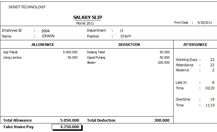Dimana pada waktu tersebut para karyawan menerima gaji setelah sebulan full mereka bekerja. Contoh slip gaji untuk pegawai yang anda temukan boleh jadi memiliki beberapa perbedaan, tetapi tetap memiliki bentuk format dan komponen umum seperti. Salah satunya adalah surat ini harus menggunakan bahasa yang formal dan informasi yang dituangkan harus jelas. Contoh slip gaji karyawan resmi adalah bukti resmi pembayaran gaji/penghasilan karyawan. Pada contoh slip gaji sederhana di atas terlihat bahwa slip gaji berisikan informasi tentang nama dan logo perusahaan, tanggal pemberian gaji, data pekerja, nominal gaji bersih pekerja yang diperoleh dari jumlah gaji pokok beserta tujangan, lembur dan bonus dikurangi potongan gaji. 13 tahun 2003 tentang ketenagakerjaan, menyatakan bahwa setidaknya besaran gaji pokok yang diterima oleh karyawan 75% dari jumlah gaji pokok dan. Slip gaji merupakan bentuk tanda bukti atas gaji atau pembayaran untuk seorang pekerja. Gambar diatas adalah salah satu format contoh slip gaji sederhana. 20 oktober 2019 posisi : Bahkan surat ini harus mencantumkan potongan apa saja yang mungkin dikenakan kepada. Buat cop rasmi bisnes (untuk semua tujuan rasmi nanti) 3. Termasuk di antaranya adalah nama, nomor ktp, nomor induk kepegawaian dan alamat. Contoh surat undangan halal bihalal untuk pembicara di komunitas kampus.